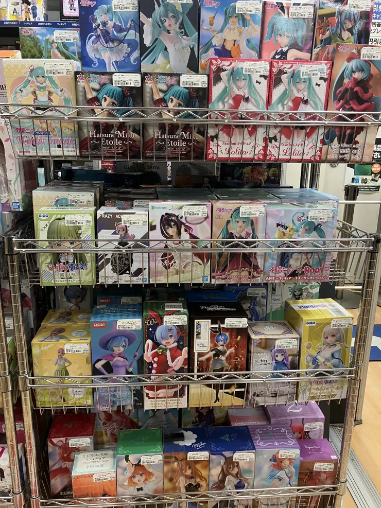 お写真にいる初音ミクちゃんのシリーズをはじめ五等分の花嫁やワンピース、鬼滅の刃などなどたくさんのキャラクターのフィギュアを入荷いたしました