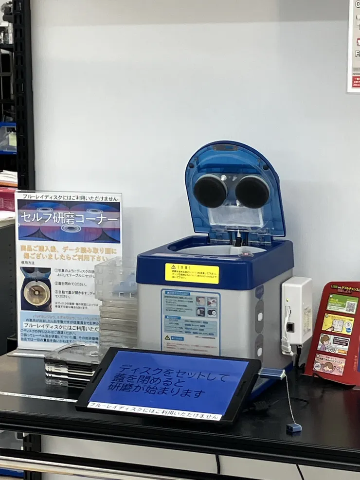 SUPER BAZAARの売りである商品の豊富さは当然ですが、買取のセルフ受付機(預ける物などを入力して発券)や、購入したCD・DVDをセルフ研磨できるコーナーなど、新店ならではの新機能を随所に発見!