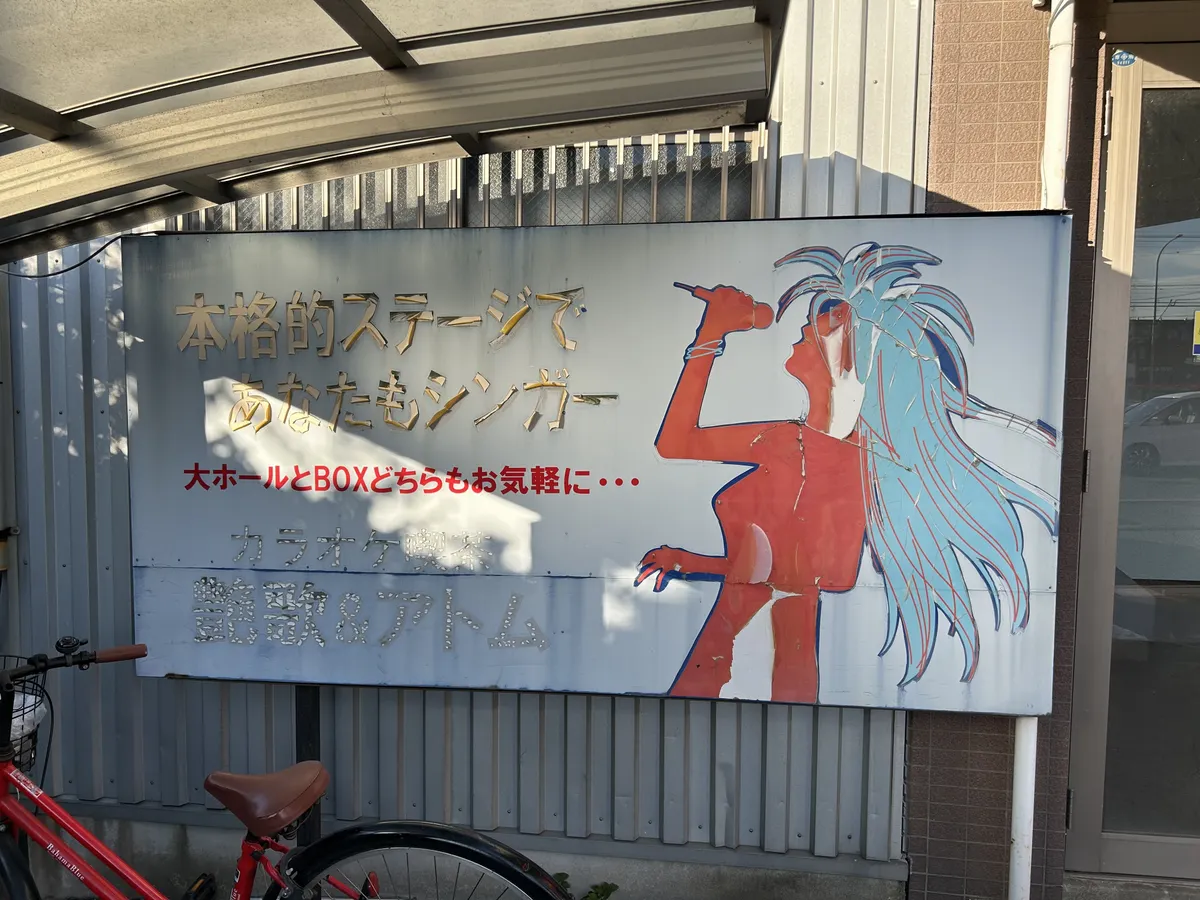 近づいてみると「カラオケ喫茶 艶歌&アトム」のちょっとレトロな看板がありました