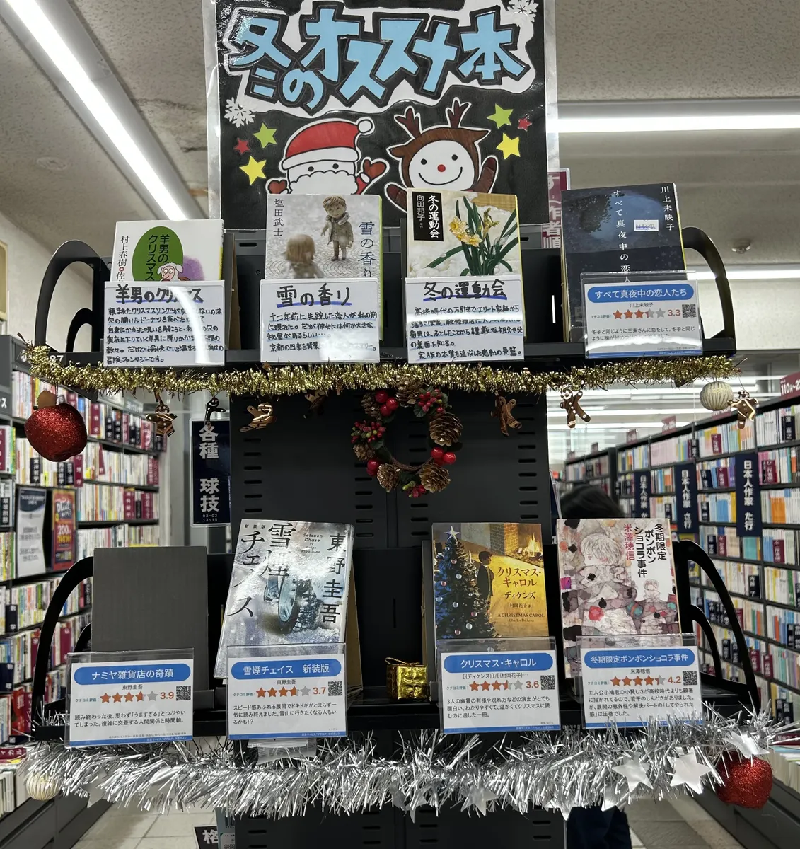 ちなみに、写真冬のおすすめ本コーナーで唯一本がない「ナミヤ雑貨店の奇蹟」ですが、読んでる途中、