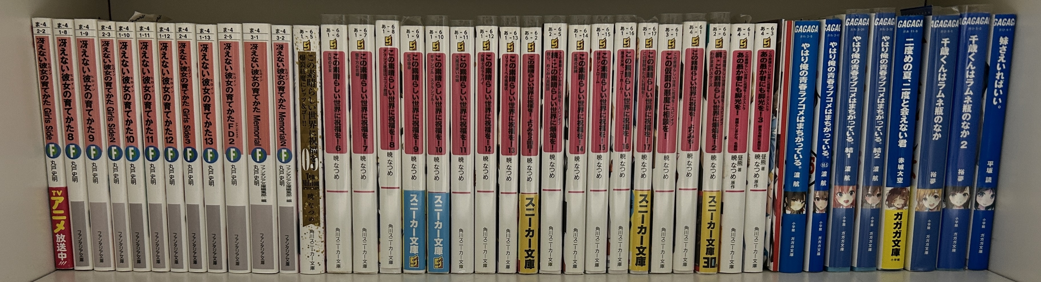 トップ > 💛なんでも > 本棚紹介そのニ ハヤ 2025/12/02 21:00 本棚紹介そのニ はい。 前回に引き続きライトノベルの紹介です。 2年ほど前はほとんどライトノベルを集めていたのでかなり多いですがお付き合いくださいまし。 わかりやすくこのすばがあり、その他ちょろちょろあります。 こんなにあるのにこのすばは8までしか読めていません。 今絶賛アニメ放送中のチラムネも読めておりません。いつか絶対に読むぞという意志だけあります。 あと3回ほどラノベ編が続きます。 多いな〜😱 本棚紹介 いいね 共有する 共有する X facebook LINE リンクをコピー コメントする 0 件の返信 (新着順)