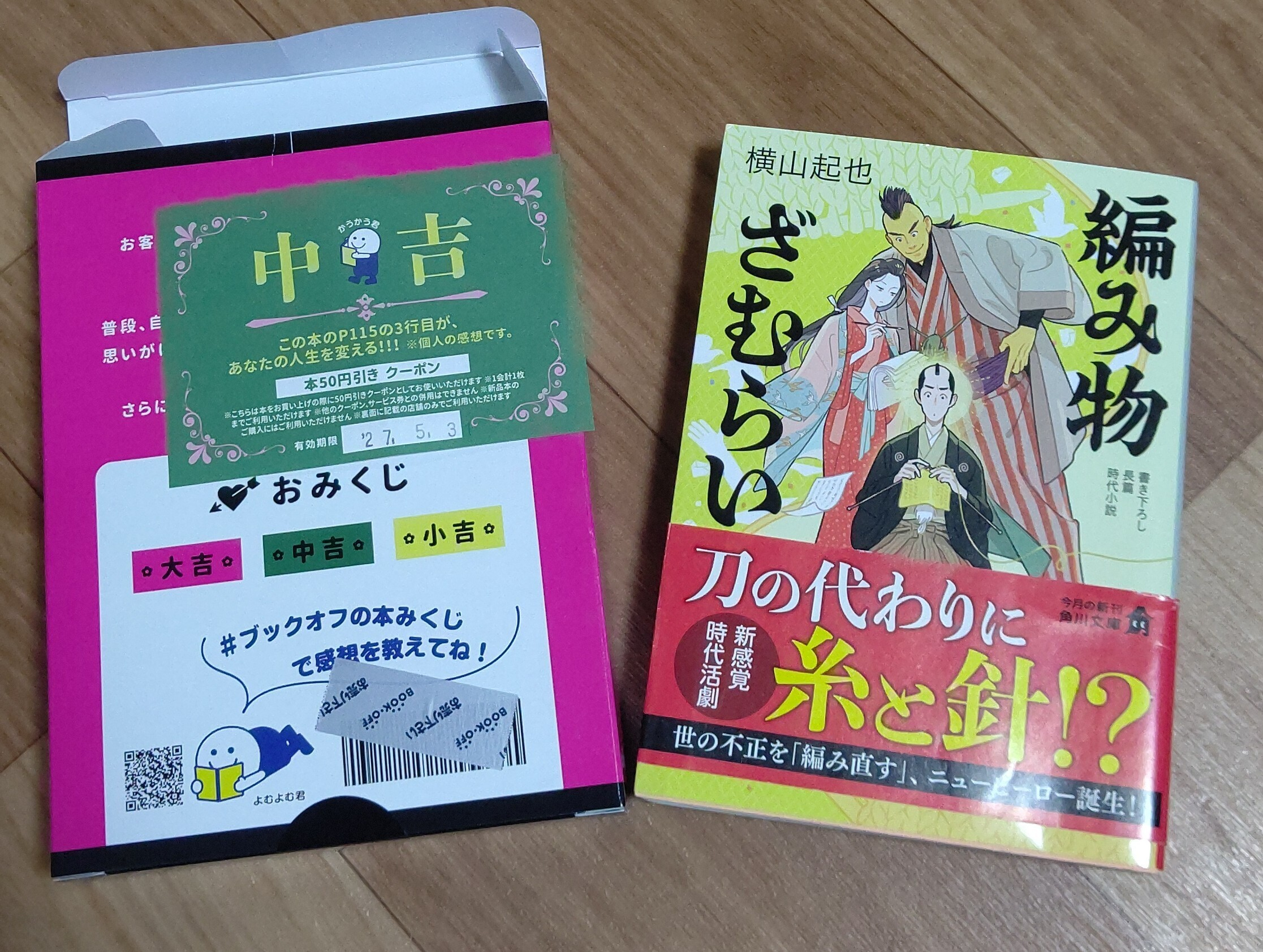 トップ > 👜買った > 本みくじ kayotine 2025/11/10 17:41 本みくじ 今回の本みくじは中吉でした!😆 まさかの時代小説👀編み物ざむらい👀👀 時代小説はあんまり読んだことないので(しゃばけくらい)、楽しみです🤭 よむよむ君の一言が「この本のP115の3行目があなたの人生を変える!!!」 なんと👀👀👀 面白いですね!😆😆 いいね 共有する 共有する X facebook LINE リンクをコピー コメントする 4 件の返信 (新着順) ミュートしたユーザーの投稿です。 投稿を表示 瑠琉 2025/11/17 21:51 面白そう!! 私は本みくじで歴史ものはまだ出た事がないです。 kayotineさんのこの投稿で知らなかった本と出会えました~。 今度探してみます。 ありがとうございます。 いいね 返信する ミュートしたユーザーの投稿です。 投稿を表示 kayotine 2025/11/17 23:09 瑠琉 本みくじ、初めて時代小説が出ました!😳 しかもなかなかのインパクトあるタイトル🤭 面白そうですよね!😆 葉桜の季節に~が読み終わったのでこれから読む予定です💪 いいね 返信する ミュートしたユーザーの投稿です。 投稿を表示 大神 2025/11/10 21:26 中吉は50円引きのクーポンなんですね😳 初めて知りました! 大吉だと100円引きなんでしょうか🤔 いいね 返信する ミュートしたユーザーの投稿です。 投稿を表示 kayotine 2025/11/10 22:45 大神 大吉1回だけ出たことありますが、クーポン50円引きでした🤔 でも本は話題作で多分500円くらいするものだったと思います🤔 いいね 返信する ミュートしたユーザーの投稿です。 投稿を表示 いもてて 2025/11/10 19:41 私も時代小説はあまり馴染みがないのですが(私も、しゃばけを読んだくらいです)、編み物ざむらい、面白そう😄 探してみようかなと思いました! いいね 返信する ミュートしたユーザーの投稿です。 投稿を表示 kayotine 2025/11/10 21:17 いもてて しゃばけ面白いですよね!☺️✨ 編み物ざむらい、ちょっと調べたら3作目まで出てるみたいです👀 続編が出ているなら面白いのかな~と期待しています😆😆 いいね 返信する ミュートしたユーザーの投稿です。 投稿を表示 まっくろくろすけ 2025/11/10 18:00 世の不正を「編み直す」ニューヒーロー👀おもしろいですね😆 いいね 返信する ミュートしたユーザーの投稿です。 投稿を表示 kayotine 2025/11/10 21:12 まっくろくろすけ 面白そうですよね😆 まずタイトルのインパクトが強いです🤣編み物ざむらい👀👀 いいね 返信する
