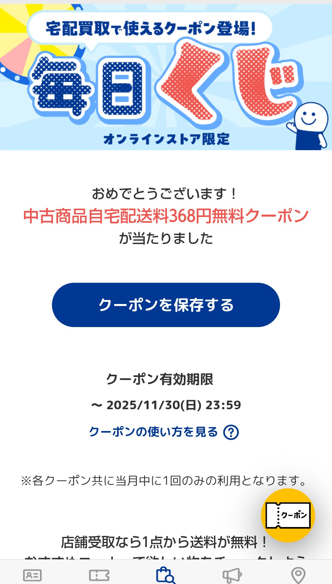 トップ > 💛なんでも > 今日はこれでした 大神 2025/11/06 21:20 今日はこれでした 自宅配送にすればスタンプの条件が達成できるのですが… 使いたいけど自分が使う日が来るのは遠い気がします😂 ブックオフオンライン いいね 共有する 共有する X facebook LINE リンクをコピー コメントする 1 件の返信 (新着順) ミュートしたユーザーの投稿です。 投稿を表示 まっくろくろすけ 2025/11/06 21:29 送料無料クーポン良いですね! スタンプの条件の自宅配送は送料が気になってなかなか達成できなくて… このクーポンが出たら自宅配送で注文したいなぁと思ってます😊 いいね 返信する ミュートしたユーザーの投稿です。 投稿を表示 大神 2025/11/07 07:35 まっくろくろすけ 店舗受取がメインなので中々使う機会がないですが、逆に店舗受取できない商品でどうしても欲しい物があれば使ってみたいです! まっくろくろすけさんも当たりますように🙏 いいね 返信する ミュートしたユーザーの投稿です。 投稿を表示 まっくろくろすけ 2025/11/07 17:50 大神 ありがとうございます😊 いいね 返信する