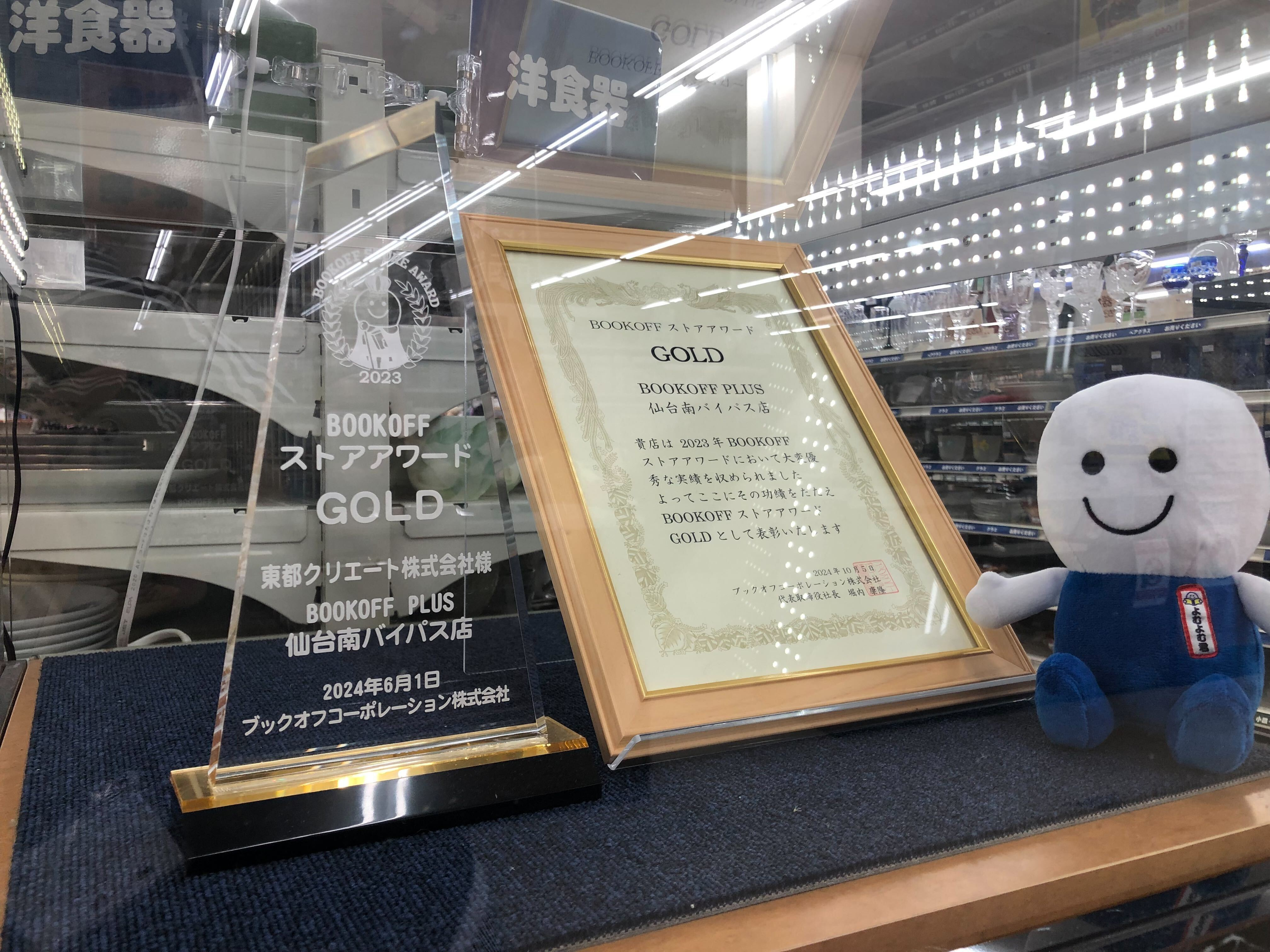 「2023ブックオフストアアワードGOLD」の賞状とトロフィーです!!!