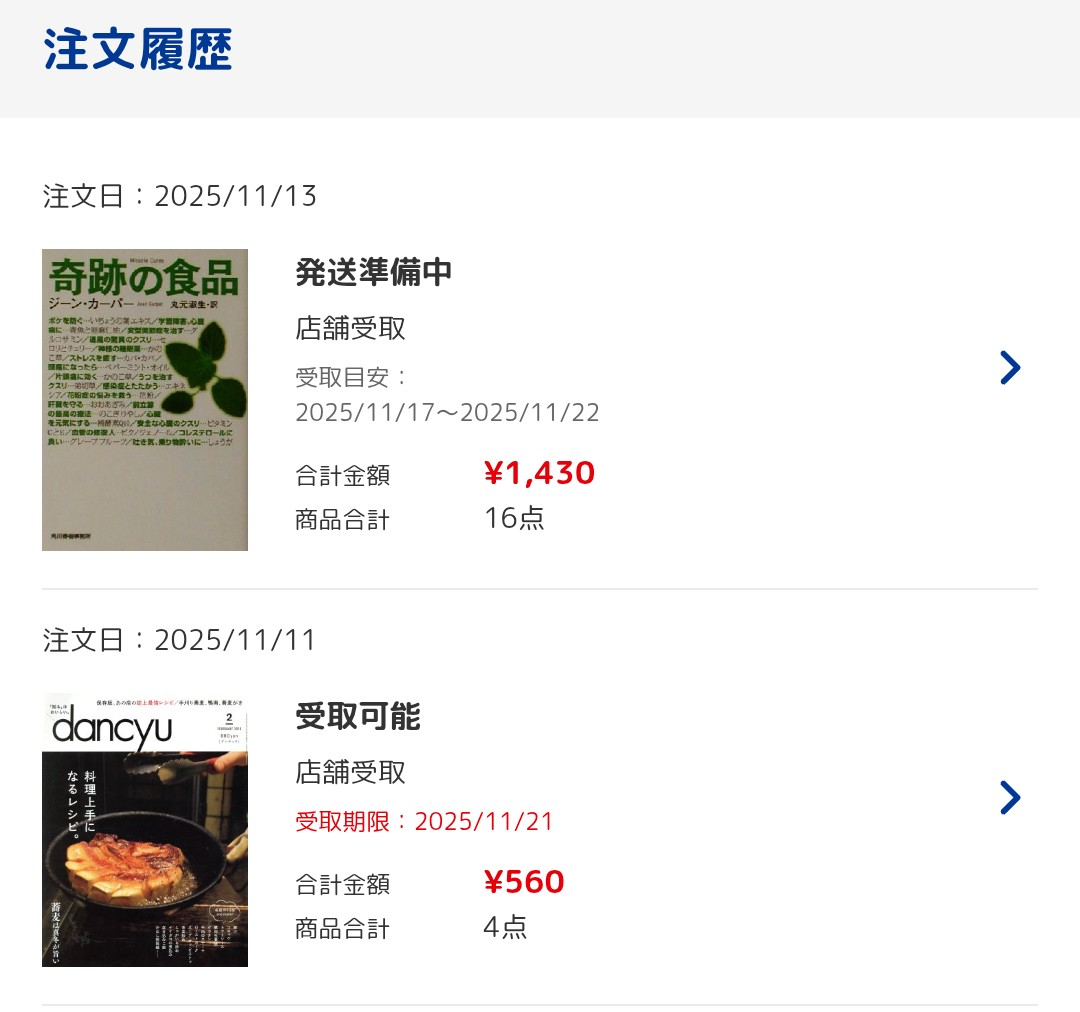 トップ > 👜買った > 注文履歴 bookon 2025/11/14 23:55 注文履歴 ブラックフライデーセール始まったので早速ポチッと👆 今年も色々と豊作な予感…🥰 セール中は時間と駆け引きで注文確定まで気を抜けないと初参戦した年にとても実感したのは今も覚えてます🥲 店舗受取メールが来たので下は明日回収してきます♪ 2025BOOKOFFBESTBUYも早く投稿しなきゃ😱 最近100円税抜縛りで5年越しに全巻揃った「 いつかティファニーで朝食を」だったのですけど…違う候補が出来てしまったので仕方がないですね🤭 ブックオフオンライン ブラックフライデーセール BOOKOFFでの出会いはいつも一期一会 いいね 共有する 共有する X facebook LINE リンクをコピー コメントする 2 件の返信 (新着順) ミュートしたユーザーの投稿です。 投稿を表示 まっくろくろすけ 2025/11/15 21:38 ブラックフライデーセール、無事たくさん購入できて良かったですね😊 「いつかティファニーで朝食を」私も集めてますが、100円税抜き縛りで全巻はすごいです!! いいね 返信する ミュートしたユーザーの投稿です。 投稿を表示 bookon 2025/11/16 02:28 まっくろくろすけ 有難うございます! 11巻から14巻(最終巻)を入手するのにかかった時間とも言えます。 いいね 返信する ミュートしたユーザーの投稿です。 投稿を表示 大神 2025/11/15 07:41 セールで買えてよかったです😆 時間との勝負で焦りますよね💦 自分も今年こそ何か買いたいです! いいね 返信する ミュートしたユーザーの投稿です。 投稿を表示 bookon 2025/11/16 02:22 大神 有難うございます! いいものが買えますように✨ いいね 返信する