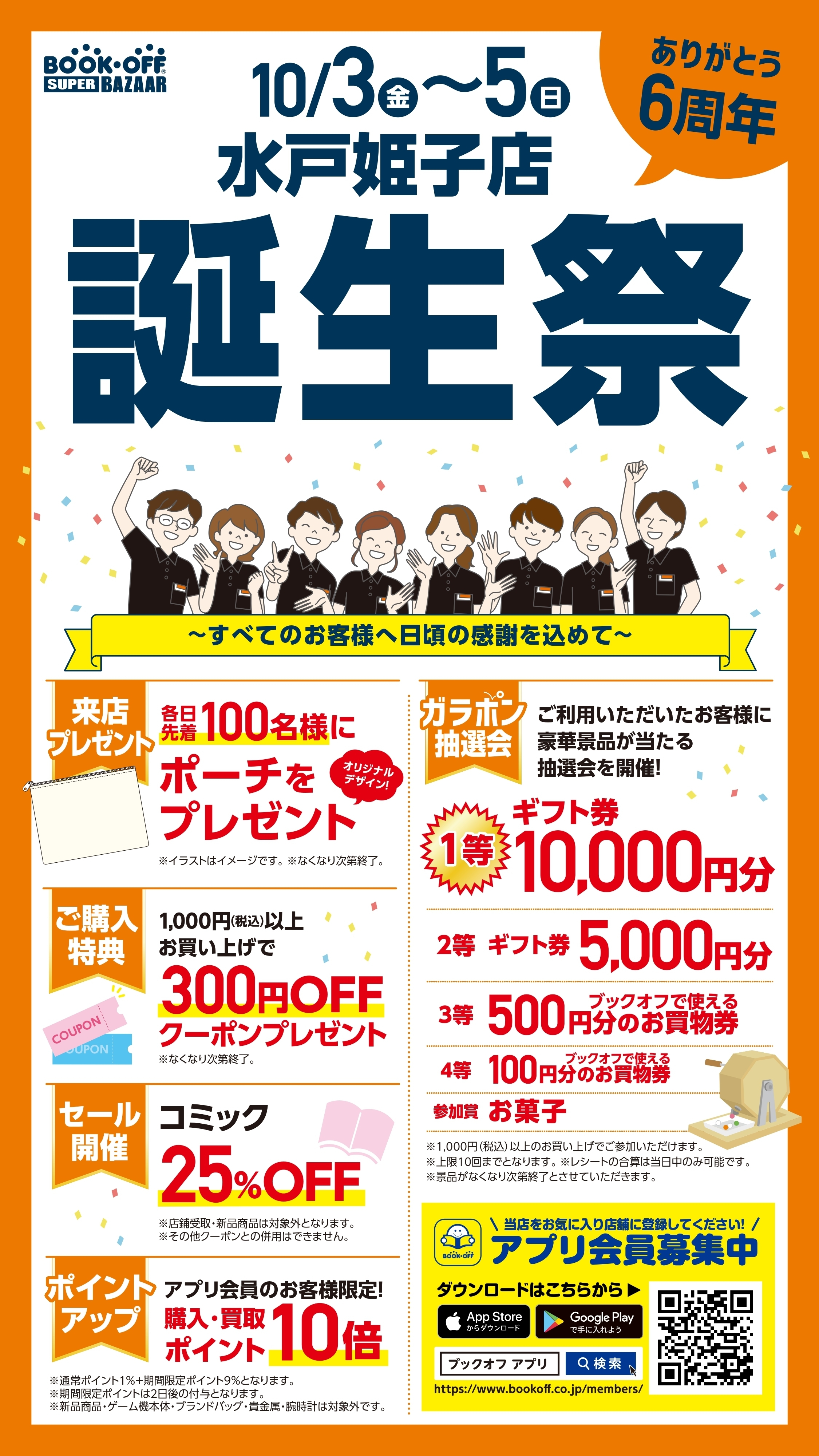 トップ > 💭お店のつぶやき > 水戸姫子店6周年誕生祭! BSB水戸姫子店 2025/09/20 10:36 水戸姫子店6周年誕生祭! 10/3(金)〜10/5(日) すべてのお客様へ日頃の感謝を込めて ブックオフ水戸姫子店誕生祭 を開催いたします! 様々なイベントをご用意しておりますので、 この機会にぜひご利用くださいませ 皆様のご来店をお待ちしております! #ブックオフ #水戸姫子 いいね 共有する 共有する X facebook LINE リンクをコピー コメントする 2 件の返信 (新着順) ミュートしたユーザーの投稿です。 投稿を表示 まっくろくろすけ 2025/09/20 20:56 6周年おめでとうございます🎉㊗️ 誕生祭、楽しそうですね! いいね 返信する ミュートしたユーザーの投稿です。 投稿を表示 大神 2025/09/20 12:39 6周年おめでとうございます✨ いいね 返信する