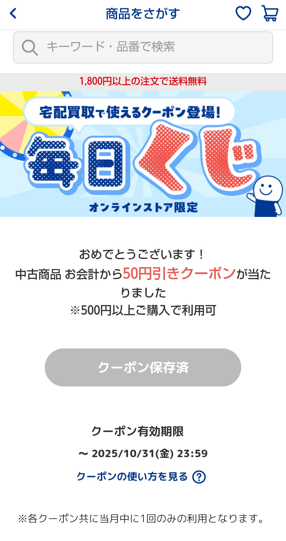 トップ > 💛なんでも > 今月のスタートは… 大神 2025/10/01 13:48 今月のスタートは… 50円引きでした!ここ最近は序盤に連続で当たりが出てたので明日以降も楽しみです😁 ブックオフオンライン いいね 共有する 共有する X facebook LINE リンクをコピー コメントする 1 件の返信 (新着順) ミュートしたユーザーの投稿です。 投稿を表示 まっくろくろすけ 2025/10/01 20:51 私も今日は10円引きクーポンが当たりました👍 やっぱり月初めは当たるみたいですね! 明日以降も楽しみですね✨ いいね 返信する ミュートしたユーザーの投稿です。 投稿を表示 大神 2025/10/01 21:23 まっくろくろすけ 本当ですね😊 毎日楽しみがあって嬉しいです✨ いいね 返信する