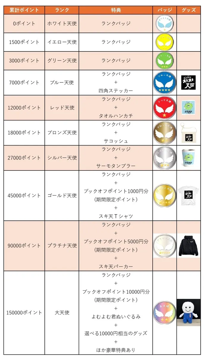 ランクが上がるとスキ天オリジナルバッジやグッズがもらえます。