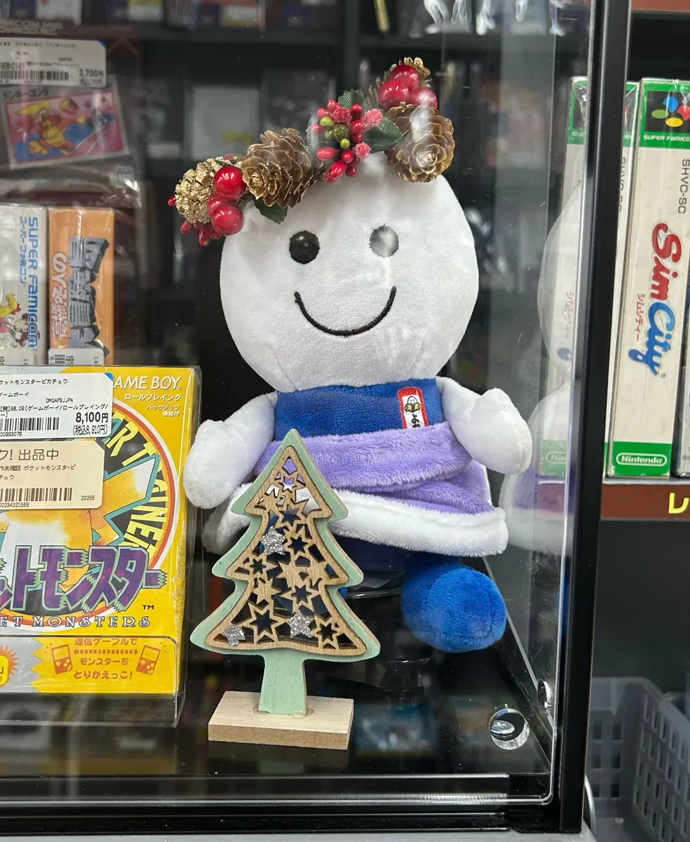 レジ横にスタッフさんの手編みの帽子をかぶった子がいますが、もうひとり、レトロゲームコーナーにもかわいい子がいます😊