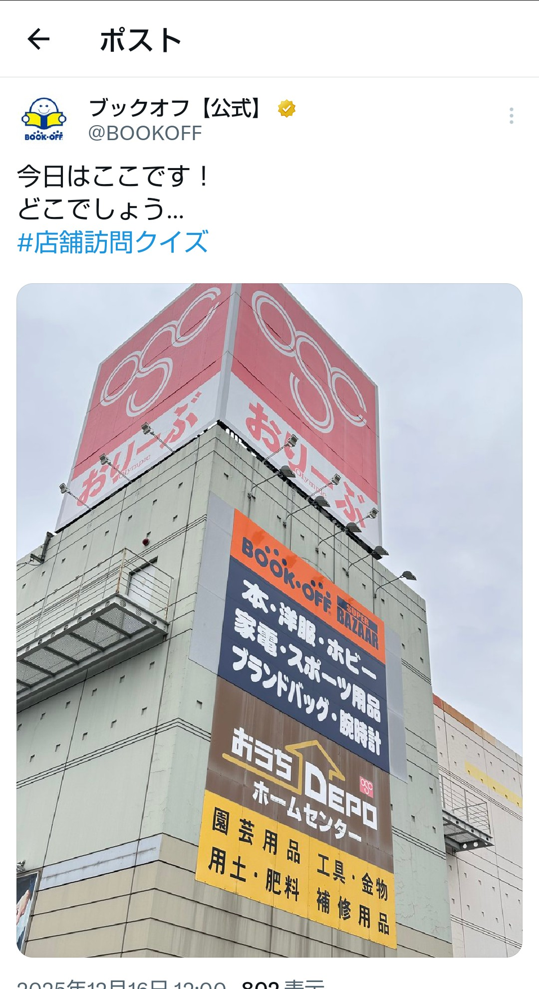 トップ > 👀見つけた > Xでまたやってました 大神 2025/12/16 12:42 Xでまたやってました 店舗訪問クイズです。わかる方いますか🤔 いいね 共有する 共有する X facebook LINE リンクをコピー コメントする 5 件の返信 (新着順) ミュートしたユーザーの投稿です。 投稿を表示 kayotine 2025/12/18 08:19 東戸塚オリンピック店😆たまに行く店舗が出ると何だかちょっと嬉しいです🤭 店舗訪問クイズ面白いですね😆 本当に上部分だけは激ムズでしたが🤣 いいね 返信する ミュートしたユーザーの投稿です。 投稿を表示 大神 2025/12/18 12:58 kayotine 皆さん正解されてて凄いなと感心しています😊 店舗クイズによむよむ君クイズと楽しい企画がどんどん増えますね✨ いいね 返信する ミュートしたユーザーの投稿です。 投稿を表示 カタギリ 2025/12/16 23:04 この店舗は「BOOKOFF SUPER BAZAAR 横浜東戸塚オリンピック店」ですね。 実は、つい先日行ったばかりだったんです(笑) いいね 返信する ミュートしたユーザーの投稿です。 投稿を表示 大神 2025/12/18 12:57 カタギリ 皆さんすぐにわかって凄いです😁 ではいいタイミングでこちらのクイズが出たんですね😉 いいね 返信する ミュートしたユーザーの投稿です。 投稿を表示 まっくろくろすけ 2025/12/16 19:04 今回は情報が多かったですね! ジンさんに賛成✋ 店舗訪問クイズ、楽しいですね😊 いいね 返信する ミュートしたユーザーの投稿です。 投稿を表示 大神 2025/12/16 20:29 まっくろくろすけ 皆さん凄いですね😆✨ やっぱり見てると色々なブックオフに行きたくなります いいね 返信する ミュートしたユーザーの投稿です。 投稿を表示 ジン 2025/12/16 12:49 今回はヒント多くて助かりました いいね 返信する ミュートしたユーザーの投稿です。 投稿を表示 ジン 2025/12/16 12:48 恐らくここです! いいね 返信する ミュートしたユーザーの投稿です。 投稿を表示 大神 2025/12/16 20:28 ジン 流石ジンさん!見つけたんですね😳 凄い👍 いいね 返信する