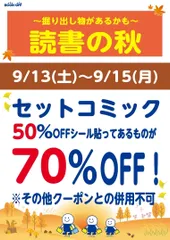読書の秋!さあブックオフへ! 夏が終わると秋が来る!そんな秋にぴったりの言葉があるでしょう!それは○○の秋!当店もそれに倣い読書の秋と称して今日から3日間、セットコミック50%引きになるものがレジにて70%引き!いつもより大変お買い得! また、9/13(土)~9/23(火・祝)の11日間500円お買い上げごとに50円引