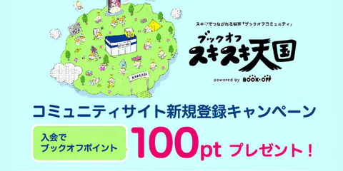 \ブックオフポイント100ptもらえる!新規会員登録キャンペーン開催中/ 天使みなさまいつもスキスキ天国にご来”天”いただきありがとうございます。スキスキ天国運営事務局です。2024年6月にブックオフ公式コミュニティサイトとしてOPENしたスキスキ天国では現在、ブックオフで、スキ!で、つながる仲間を大募集中です。スキスキ天国って?どんなことができるの?ブックオフのお店で見
