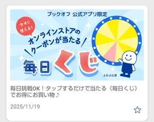 たまにくじのお知らせは来るんですが、このイラスト付きでのお知らせはあんまり記憶にないような… ちなみに自分はあれから当たりが全くきません😂100円引きが当たってほしい!