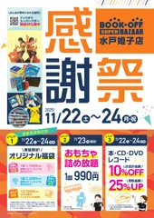 今週末は水戸姫子店へGO! 【イベント情報】 11月22日~11月24日まで、 全国のブックオフスーパーバザーで感謝祭を実施いたします! 当店では、福袋やオリパ、おもちゃ詰め放題、 セール開催して皆様のご来店をお待ちしております! ぜひこの機会にブックオフへご来店ください!
