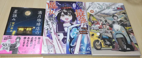 ◎ゆるキャン山と食欲と私→山を渡る→ふたりソロキャンプ→もふっとキャンプなどから興味を持った作品でここ1年位でお得に購入できるようになったので集めるようになりました。興味を持った順にしてみました。◎世界最強の魔女、始めましたバナーで知った作品ですが、面白すぎるの一言に尽きます!◎満月珈琲店の星詠みグ