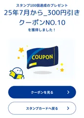 スタンプ50個目 スタンプ50個目でようやく20円引、以上のクーポン出た! 今回はちょっと引きが悪かった…