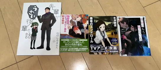 また買っちゃった(´∀`*) 本日、横浜に行ってきた際の戦利品です。探偵はもう、死んでいる。は初回特典があったので買ってしまいました。2冊目のお出迎えです👀氷菓を読みたくなりとりあえず買える巻を買いました。同じ米澤先生の小市民シリーズも気になっていたので購入。先輩がうざい後輩の話はしろまんた先生の作品ということで気になり購入しま