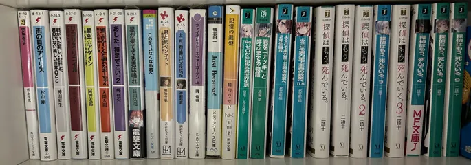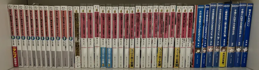 はい。 前回に引き続きライトノベルの紹介です。2年ほど前はほとんどライトノベルを集めていたのでかなり多いですがお付き合いくださいまし。わかりやすくこのすばがあり、その他ちょろちょろあります。こんなにあるのにこのすばは8までしか読めていません。今絶賛アニメ放送中のチラムネも読めておりません。