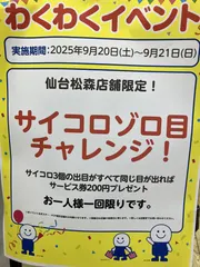 誕生祭開催 前日の投稿でも告知をさせていただきましたが、当店、本日と明日に誕生祭を開催しております! 当店B・SPORTS仙台松森店ではサイコロゾロ目チャレンジのイベントを行なっております🎲 サイコロ3つのゾロ目が揃ったら200円分のお買い物券をプレゼント🎫 本日は今のところ、お二