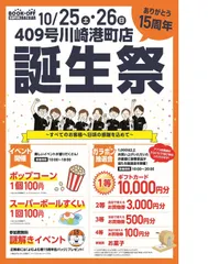 【川崎港町店】誕生祭開催決定! 川崎港町店 15周年 誕生祭開催します🙌 10月25日(土)、26日(日)の2日間、川崎港町店では、日頃の感謝を込めて誕生祭を開催いたします‼️ ポップコーン販売🍿、スーパーボール掬い、謎解きイベント👻などのイベントが盛りだくさん😍1000円以上のお買物をしていただいた方には豪華