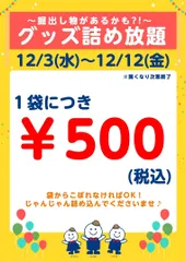 🎉グッズ詰め放題やりまーす!!!🎉 ☃️イベント情報☃️当店では明日12/3(水)~12/12(金)の期間中アニメ・ゲーム・その他キャラクター物のグッズ詰め放題イベントを開催しまーす😆‼️専用の袋から溢れなければいくら詰めても500円‼️じゃんじゃん詰めてくださーい💪‼️こちら入口すぐのスペースにご用意しています!!!無くなり次第終了