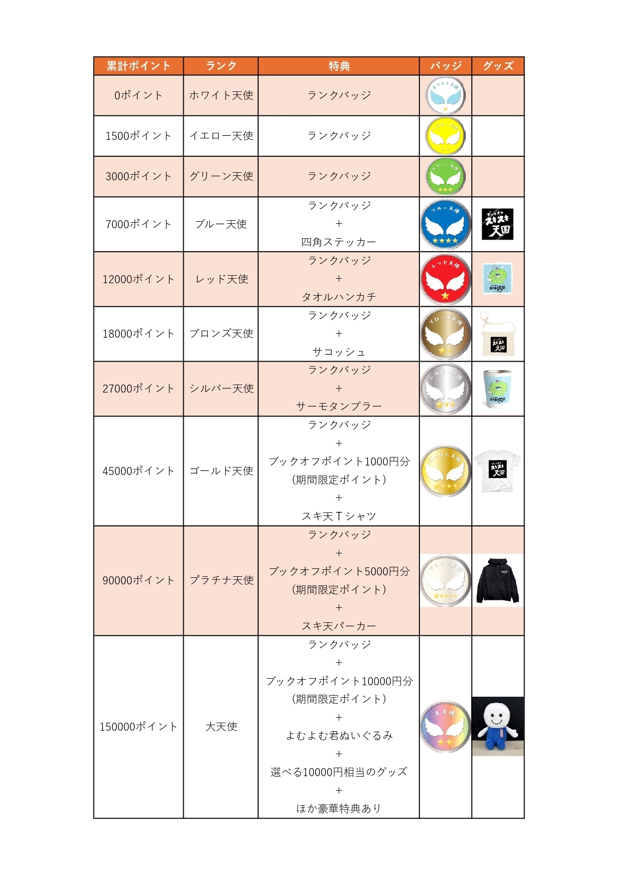 活動すればするほど、ポイントが貯まっていきます。累計のポイントに応じてランクが上がり、また、ランクアップの特典としてランクに応じたブックオフスキスキ天国オリジナルグッズがもらえます。